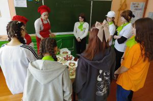 Анастасия Александровна Фарфудинова, учитель технологии МБОУ Холмогойская СОШ, провела мастер-класс «Повар – мой профессиональный выбор» по приготовлению соуса (майонеза) на основе зеленого масла, определению крахмалосодержащего наполнителя в колбасных изделиях.